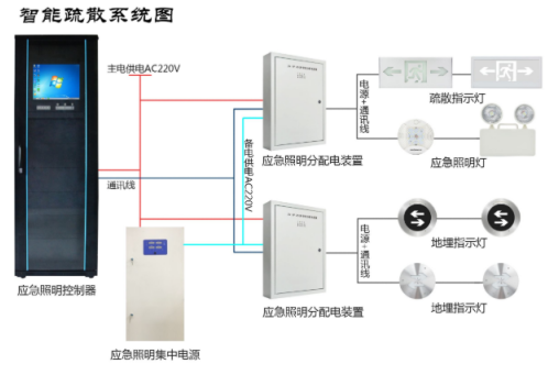 智能疏散指示系統是包括煙火探測器,自動火災報警主機,消防應急電源,集中控制主機,中繼器,智能應急照明燈,智能應急標志燈等多種設備組成的一套智能消防疏散系統。系統具有人機交互界面,可對應急標志燈具實時巡檢、并與報警主機系統聯動、在有火災發生時根據起火位置智能選擇最佳逃生路線進行疏散指示。