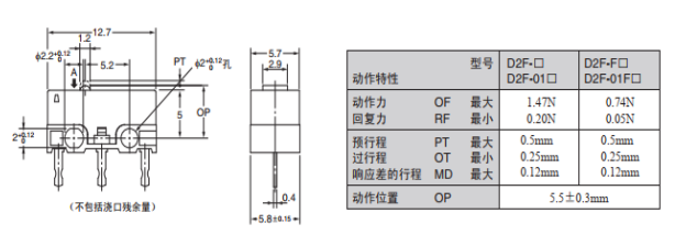 歐姆龍微動開關D2F-F的優勢:超小型,性能穩定,動作力只需要0.74N,能夠更精準地感應剎車片磨損的程度,為風力發電機的安全運作提供給更有力的保障,以下是D2F-F的尺寸圖和動作特性。