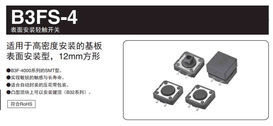我司備有各種輕觸開關都可以用于各類農機控制器中;其中平地儀還會用到輕觸開關B3FS-4系列;歡迎電話咨詢廣州鼎悅電子科技有限公司;相信我們可以帶給您不一樣的選擇;如圖: