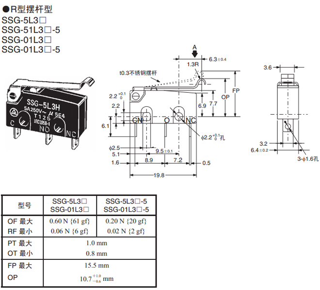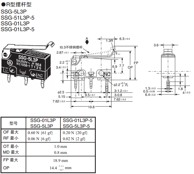 R型擺桿型 焊接端子 0.60 N {61 gf} SSG-5L3H SSG-01L3H