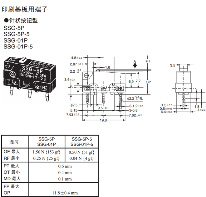 針狀按鈕型 焊接端子 1.50 N {153 gf} SSG-5H SSG-01H