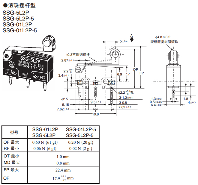 滾珠擺桿型 焊接端子 0.60 N {61 gf} SSG-5L2H SSG-01L2H