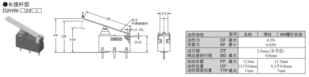 社內(nèi)較小尺寸、可進(jìn)行可靠開關(guān)的長(zhǎng)行程型開關(guān) 主體部分尺寸為前代產(chǎn)品的78%,有利于設(shè)備的小型化。 沒有擺桿也同樣使用方便的長(zhǎng)行程規(guī)格 (OT參考值 :1.4mm) 不含對(duì)環(huán)境有害的物質(zhì),導(dǎo)線類型也實(shí)現(xiàn)了無鉛化。