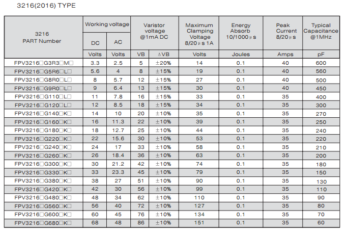 多層片式壓敏電阻器 FPV321611E140PKT